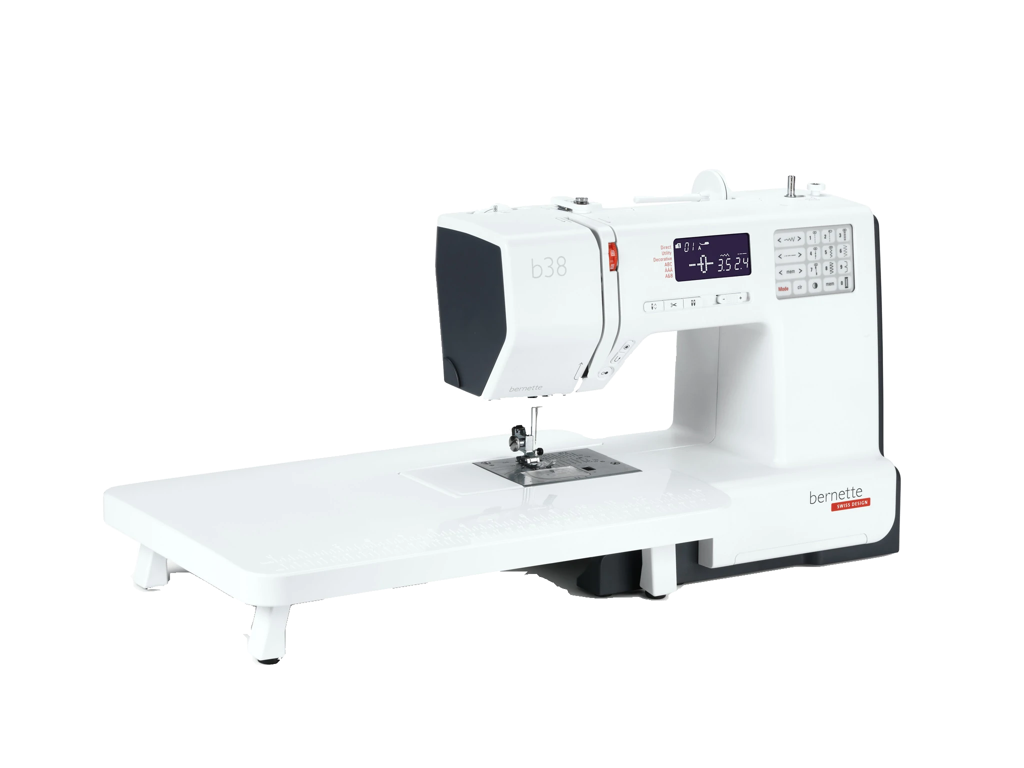 The bernette 38 is the top model in the bernette 30 series. This computerised sewing machine offers a wide range of functions at an affordable price–leaving nothing to be desired. It offers 394 different stitches, including the stretch stitch for elastic fabrics. This means you can create fantastic T-shirts from jersey fabric, for example. The bernette 38 also has eight different 1-step buttonholes and three alphabets. In addition, it has a memory function, via which you can store various combinations of patterns. The bernette 38 has a useful speed regulator, which can be adjusted on the display. As the top model, this impressive sewing machine also has a bright LED sewing light, a threader and both an automatic and a manual thread cutter. The bernette 38 comes with eight different presser feet (soles) and a large extension table as standard.